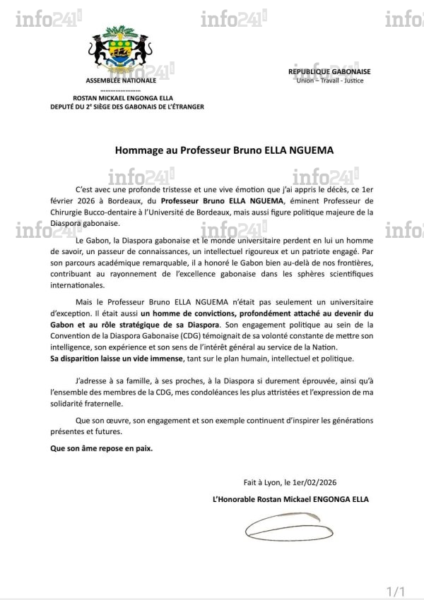 Le journaliste d’Africa Radio Pheel Pambou dit ne pas l’avoir connu personnellement, mais affirme avoir admiré « l’homme de science » et « la fierté » qu’il représentait pour le Gabon et la diaspora, soulignant une perte « immense » pour la nation comme pour la France où il exerçait. Hugues Awanhet Ntawanga, membre du Conseil économique, social, environnemental et culturel (CESEC), a également présenté ses condoléances, tandis que le député de la diaspora Rostan Mickael Engonga Ella salue la mémoire d’« un homme de savoir » et d’« un passeur de connaissances », dont l’action a contribué au rayonnement de l’excellence gabonaise au-delà des frontières.