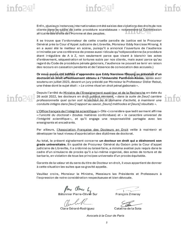 Dans leur requête envoyée en masse à ces 6 personnalités, les conseils de Sylvia et Noureddin Bongo Ondimba présentent le magistrat comme l’ « ordonnateur » d’un « simulacre de procès » et d’une « cruelle parodie de justice » . Ils évoquent « enlèvement » , « séquestration » , « tortures et actes de barbarie » , puis un « procès inique » . Le ton est grave, presque théâtral. Mais il ne répond pas à la question centrale : quel lien juridique existe-t-il entre ces accusations et la validité d’un doctorat soutenu en juillet 2023 ?
