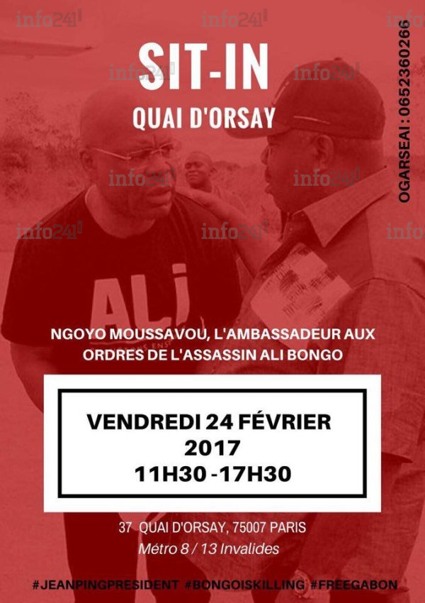 Pour les organisateurs qui réaliseront une action de contestation, le vendredi 24 Février 2017 au Quai d’Orsay de 12h à 17 heure de Paris : " il est temps que la diaspora Gabonaise de France et d’ailleurs s’invite à la cause diplomatique de notre pays. C’est notre droit. Ce vendredi, soyons nombreux devant le Ministère des Affaires Étrangères, 37 Quai d’Orsay Paris, de 11h30 à 17h30, pour dire « Non à la diplomatie mafieuse d’Ali Bongo. Car argue-t-il, le combat pour la libération du Gabon commence en France. Et on ne lâchera rien ».