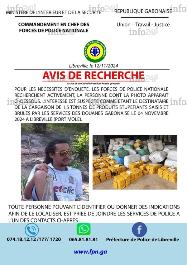 « Pour les nécessités d’enquête, les Forces de Police nationale recherchent activement la personne dont la photo apparaît ci-dessous. L’intéressé est suspecté d’être le destinataire de la cargaison de 1,5 tonne de produits stupéfiants saisis et brûlés par les services des Douanes gabonaises, le 4 novembre à Libreville (Port-Môle) », précise l’avis de recherche de la police gabonaise. En effet, le 4 novembre, la saisie de 1 561 tablettes de cannabis, soit environ 1,4 tonne, avait une valeur de 140 millions de FCFA. Ce stock de stupéfiants, mis sous scellé, a été brûlé dans les heures qui ont suivi.
