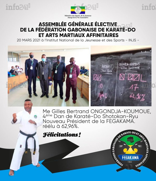 Et de deux pour Gilles Bertrand Ongondja Koumoue ! Le président sortant de la Fédération gabonaise de karaté do et arts martiaux affinitaires (Fégakama) a été élu hier pour un second mandat. Pour y parvenir, il devait venir à bout de son challenger Jean-René Akoghet au cours d’une assemblée générale élective tenue samedi à l’Institut national de la jeunesse et des sports (INJS) de Libreville.