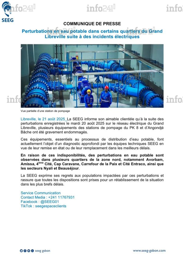 Depuis ce mardi, plusieurs quartiers du Grand Libreville connaissent d’importantes difficultés d’approvisionnement en eau potable. Selon un communiqué transmis ce jeudi à la rédaction d’Info241 par la Société d’énergie et d’eau du Gabon (SEEG), ces perturbations font suite à des incidents électriques majeurs survenus le 20 août 2025, qui ont gravement endommagé plusieurs équipements essentiels des stations de pompage du PK 8 et d’Angondjé Bâche.