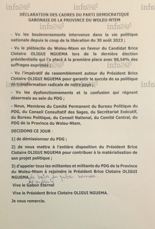La déclaration de démission collective des membres du Woleu-Ntem vendredi dernier