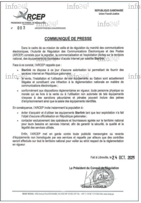 L’ARCEP constate « la commercialisation et l’exploitation illicites des équipements du fournisseur d’accès Internet par satellite Starlink » et rappelle que le service « ne dispose à ce jour d’aucune autorisation lui permettant de fournir des services Internet en République gabonaise ». En conséquence, toute installation, utilisation ou vente du matériel est désormais considérée comme illégale et passible de sanctions pécuniaires et pénales, incluant la saisie des équipements.