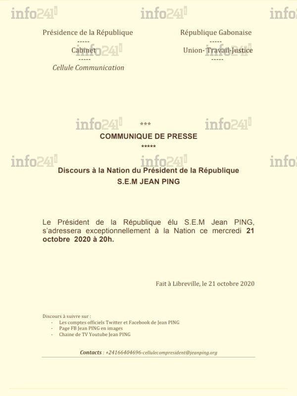 L’actualité récente du Gabon nécessite une prise de parole du président « élu » Jean Ping. C’est en tout cas ce que soutient un communiqué de presse parvenu ce mercredi à la rédaction d’Info241. Jean Ping « s’adressera exceptionnellement à la Nation ce mercredi 21 octobre à 20h », martèle le communiqué.