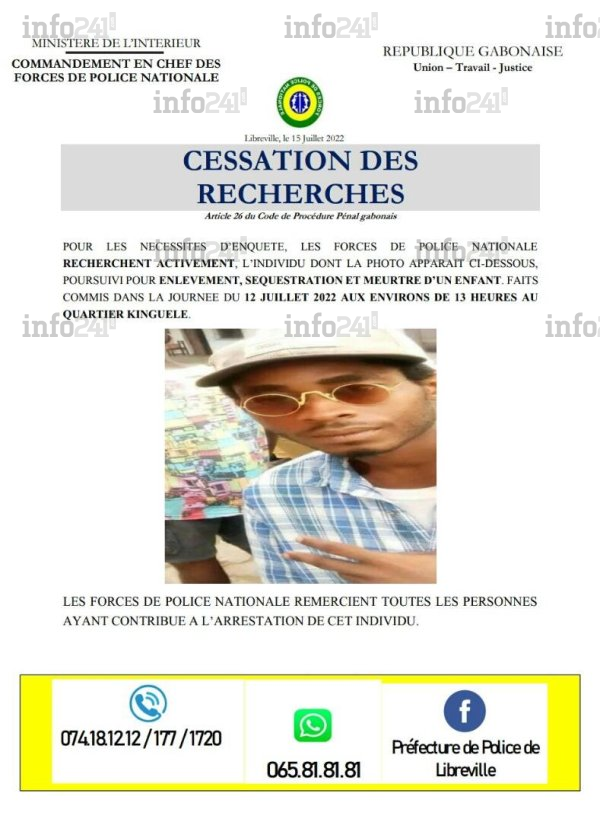 Selon l’avis de recherche lancé contre lui, Maxime Ndong Bekale alias Edgard est d’ores et déjà poursuivi pour enlèvement, séquestration et meurtre d’un enfant. « Les forces de police nationale remercient toutes les personnes qui ont contribué à son arrestation », a déclaré la police dans sa cessation de recherche. Selon nos informations, le fugitif a été arrêté après plusieurs heures de cavale à la Cité des ailes, un quartier du 6e arrondissement de la capitale gabonaise.