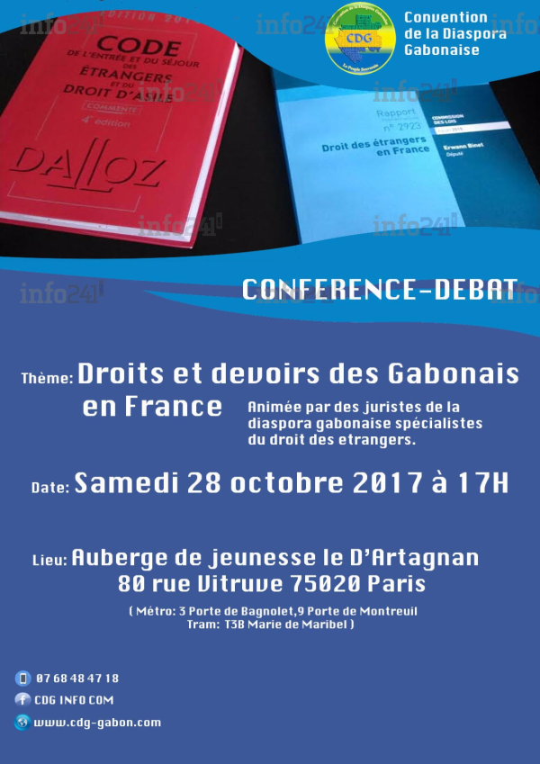 Dans un communiqué de presse parvenu ce mercredi à la rédaction d’Info241, la Convention de la Diaspora Gabonaise (CDG) informe à toute la communauté gabonaise de France, qu’après avoir été interpelée à maintes reprises par des compatriotes soucieux de connaître leurs droits en terre française, la CDG relance son cycle de conférence de conscientisation citoyenne par l’organisation d’une conférence ce samedi 28 octobre 2017 à Paris, axée sur les droits et devoirs des Gabonais en France .