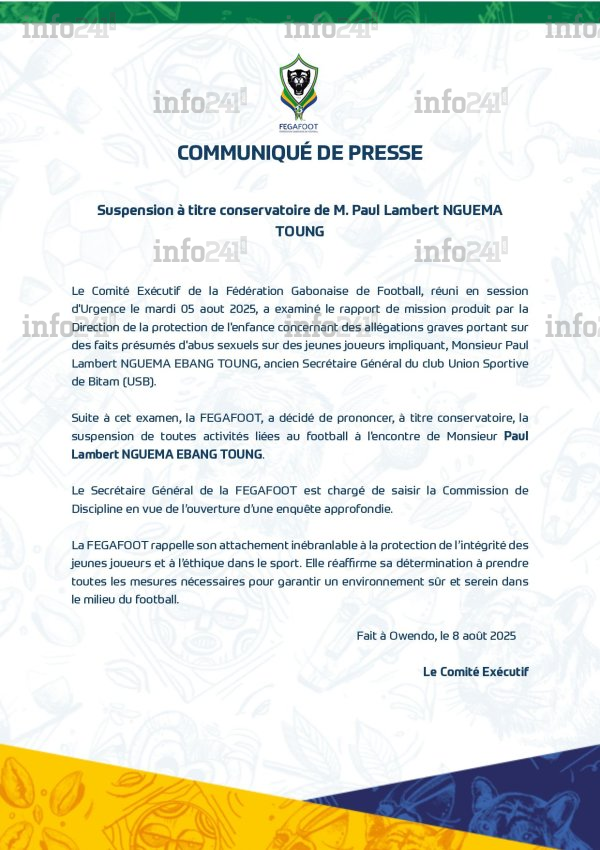 L’instance indique avoir « décidé de prononcer, à titre conservatoire, la suspension de toutes activités liées au football à l’encontre de M. Paul Lambert Nguema Ebang Toung » et a ordonné la saisine de la Commission de discipline « en vue de l’ouverture d’une enquête approfondie ».