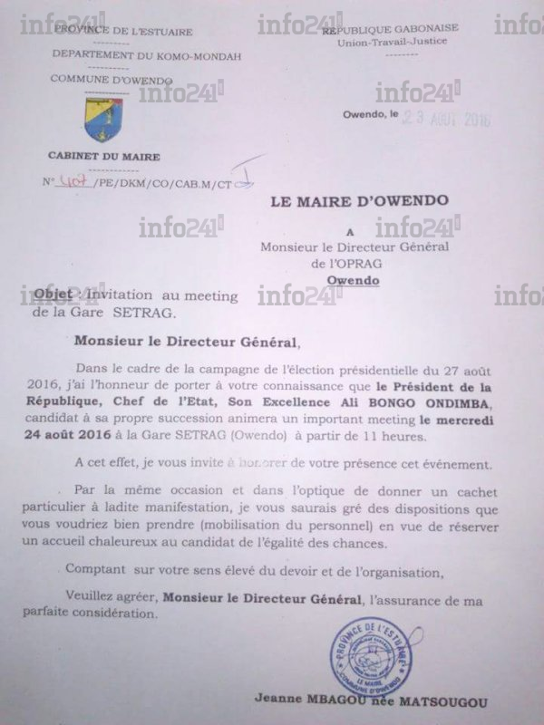 Dans cette missive aux contours brumeux, la mairesse d’Owendo par ailleurs coordinatrice de campagne locale du candidat Ali Bongo, demande chaleureusement au directeur de l’Oprag de prendre des « dispositions » afin de s’assurer de la mobilisation du personnel de l’entreprise parapublique pour le meeting d’Ali Bongo, « le candidat de l’égalité des chances », qui a eu lieu ce matin à la gare d’Owendo.