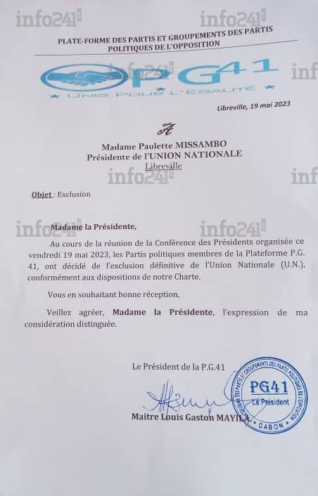 Dans son courrier de divorce, le président de la plateforme modérée informe brièvement la présidente de l’UN de la teneur de la décision prise ce vendredi au cours d’une réunion les partis membres de ce regroupement de l’opposition. « Au cours de la réunion de la Conférence des présidents organisée ce vendredi 19 mai 2023, les partis politiques membres de la plateforme PG41, ont décidé de l’exclusion définitive de l’Union nationale (UN) », précise laconiquement le courrier.