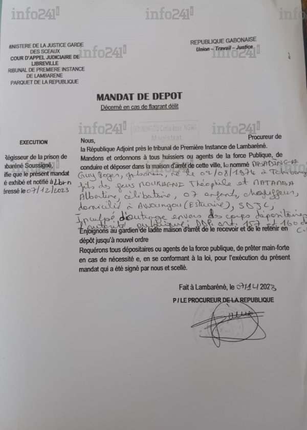 Selon le mandat de dépôt délivré par la procureure adjointe du tribunal de première instance de Lambaréné, ce père de famille aurait commis le crime de lèse-majesté en interpellant le président de la transition sur la persistance du racket opéré par les gendarmes. Il a ainsi été inculpé pour « outrage envers des corps dépositaires d’autorité publique », simplement pour avoir exprimé à voix haute ses interrogations sur le fait de savoir si le racket pratiqué par les forces de l’ordre servait à payer la dette extérieure du Gabon.