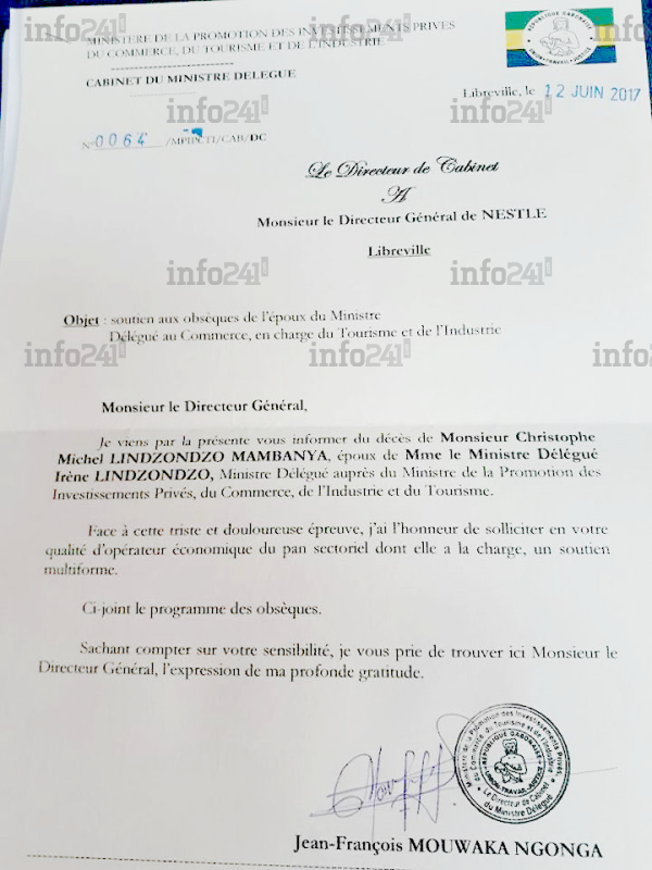 Dans cette lettre officielle datée de ce lundi 12 juin que s’est procurée Info241, Jean-François Mouwaka Ngonga demande expressément aux opérateurs économiques un « soutien multiforme » pour assister la veuve-ministre si cruellement éplorée. Comptant sur leur « sensibilité » face à ce décès, le premier collaborateur de cette ministre de la République gabonaise, entend user de sa position pour récolter toute forme d’aide y compris la générosité financière d’entreprises opérant dans son secteur ministériel.
