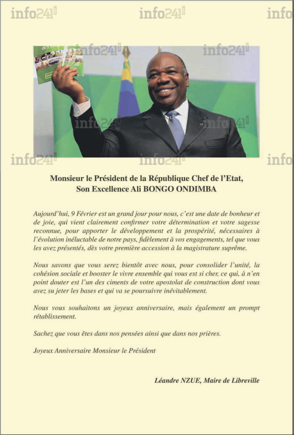 Il est pourtant de notoriété publique qu’Ali Bongo est en exil médical au Maroc depuis des mois, loin du Gabon qu’il dirige désormais depuis le Maroc. Cela n’a pas empêché visiblement le nouveau maire de Libreville, Léandre Nzue, de s’adresser à Ali Bongo, l’homme qui lui a permis de devenir enfin maire de Libreville le 3 février. Pour remercier son bienfaiteur, quoi de mieux que de lui souhaiter un joyeux anniversaire en s’offrant une page de pub dans le quotidien pro-gouvernemental qui ne parait pourtant pas au Maroc !