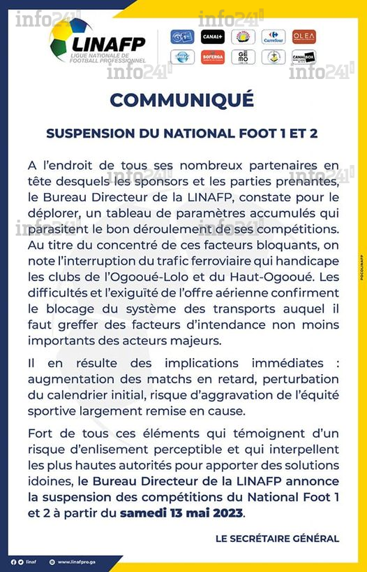 « Le Bureau Directeur de la LINAFP, constate pour le déplorer, un tableau de paramètres accumulés qui parasitent le bon déroulement de ses compétitions », a déploré hier le communiqué de suspension des compétitions de la Linaf. « Au titre du concentré de ces facteurs bloquants, on note l’interruption du trafic ferroviaire qui handicape les clubs de l’Ogooué-Lolo et du Haut-Ogooué. Les difficultés et l’exiguïté de l’offre aérienne confirment le blocage du système des transports auquel il faut greffer des facteurs d’intendance non moins importants des acteurs majeurs », rajoute le communiqué.