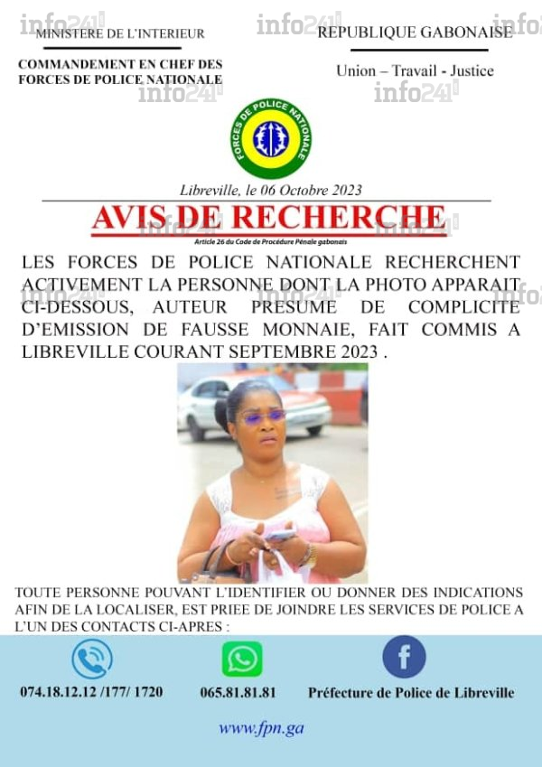 Fort de ce qui précède, le commandement en chef des forces de police nationale vient de lancer un avis de recherche afin de mettre la main sur une dame, présumée complicité d’émission de fausse monnaie. « Les forces de police nationale recherchent activement la personne dont la photo apparaît ci-dessous, auteur présumé de complicité d’émission de fausse monnaie. Des faits commis à Libreville courant septembre 2023 », précise l’avis de recherche parvenu à la rédaction d’Info241.