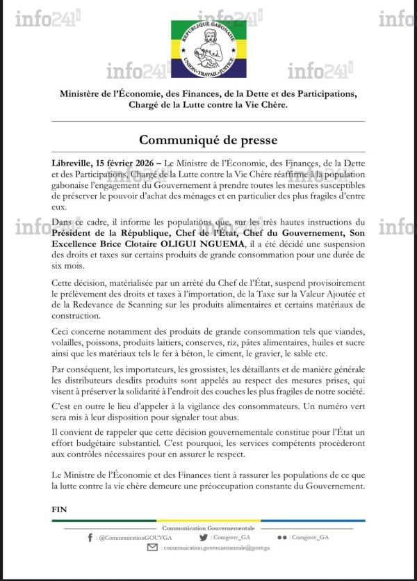 Face à l’inflation galopante qui asphyxie le portefeuille des ménages, le gouvernement gabonais a décidé de frapper un grand coup. Ce dimanche 15 février 2026 au soir, l’exécutif a annoncé à la télévision publique la suspension temporaire de plusieurs taxes et prélèvements sur une large gamme de produits de grande consommation et de matériaux de construction. Une mesure d’urgence, actée par un arrêté présidentiel, qui vise à soulager immédiatement le pouvoir d’achat des populations les plus vulnérables.