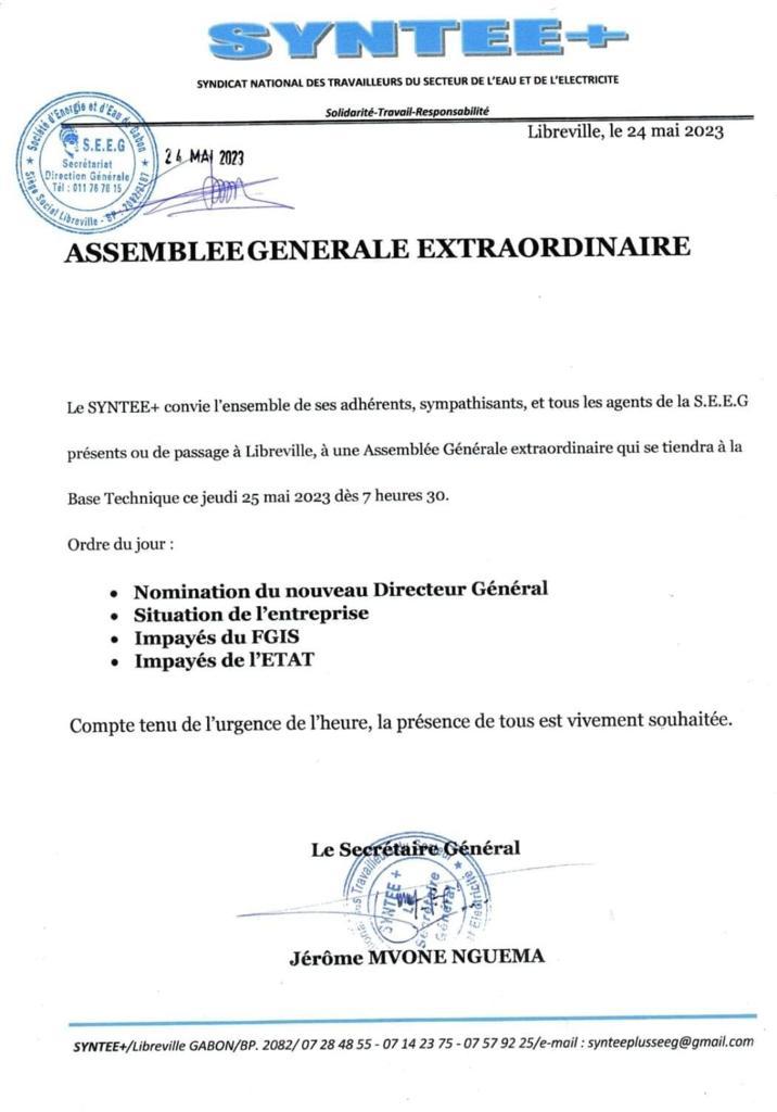 Dans son appel à une assemblée générale extraordinaire ce jeudi matin, le syndicat des agents entend ratisser large en rassemblant l’ensemble des employés. « Le SYNTEE+ convie l’ensemble de ses adhérents, sympathisants et tous les agents de la S.E.E.G présents ou de passage à Libreville, à une Assemblée Générale extraordinaire qui se tiendra à la Base Technique ce jeudi 25 mai 2023 dès 7 heures 30 », indique la note parvenue ce mercredi à la rédaction d’Info241.