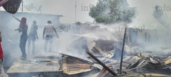 Selon les premières informations recueillies par Info241 sur place, le feu s’est rapidement propagé en raison de la saison sèche et de la nature inflammable des matériaux utilisés. Les flammes, attisées par des matelas et autres objets hautement combustibles, ont gagné plusieurs logements et atteint des installations électriques. Des câbles de lignes à haute tension ont été touchés, entraînant des coupures de courant dans différents quartiers de la ville.