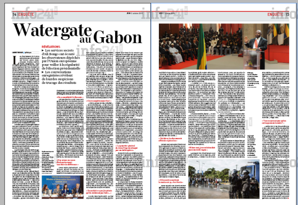 L’enquête publiée aux pages 14 et 15 de l’hebdomadaire n°3638, évoque le contenu de ces écoutes diligentées par Ali Bongo et l’inversion des résultats de la présidentielle en leur possession. Ces écoutes retranscrites montrent bien que les observateurs craignaient pour leur propre sécurité et pronostiquaient déjà sur l’annonce de résultats truqués qui favoriseraient le sortant Ali Bongo.
