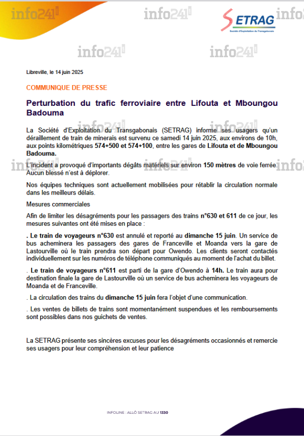 Plusieurs mesures ont été prises pour limiter les désagréments pour les usagers. Le train de voyageurs n°630, initialement prévu ce samedi, est annulé et reporté au dimanche 15 juin. « Les voyageurs au départ de Franceville et Moanda seront transférés en bus jusqu’à la gare de Lastourville où un train les prendra en charge jusqu’à Owendo », précise la société. Chaque passager sera contacté individuellement.