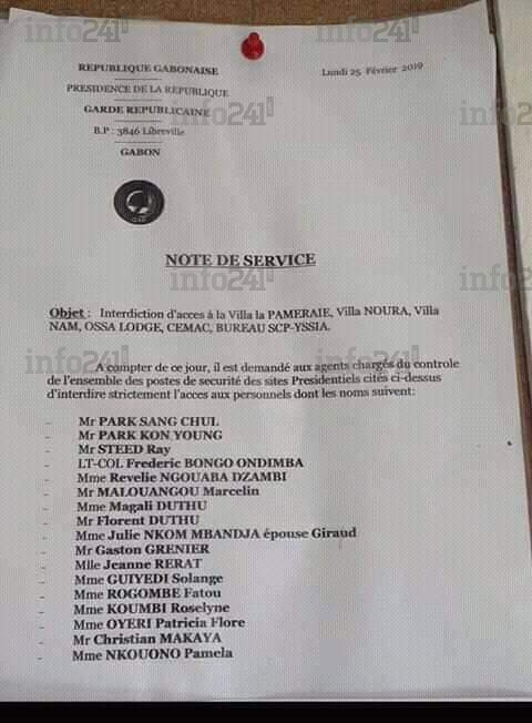 Sylvia Bongo en guerre particulière contre ces « hommes du président » a envers eux plusieurs griefs. Il est reproché à Steed Rey, par ailleurs cousin d’Ali Bongo, d’avoir signé la lettre autorisant l’hospitalisation d’Ali Bongo à Riyad en Arabie Saoudite. Park Sang Chul, de la garde rapprochée d’Ali Bongo, de n’avoir longtemps pas voulu quitter le chevet d’Ali Bongo durant son hospitalisation et son refus à confier à Sylvia le smartphone d’Ali Bongo. Quant à Frédéric Bongo, son refus du transfert d’Ali Bongo à Londres, comme le souhaitait la régente.