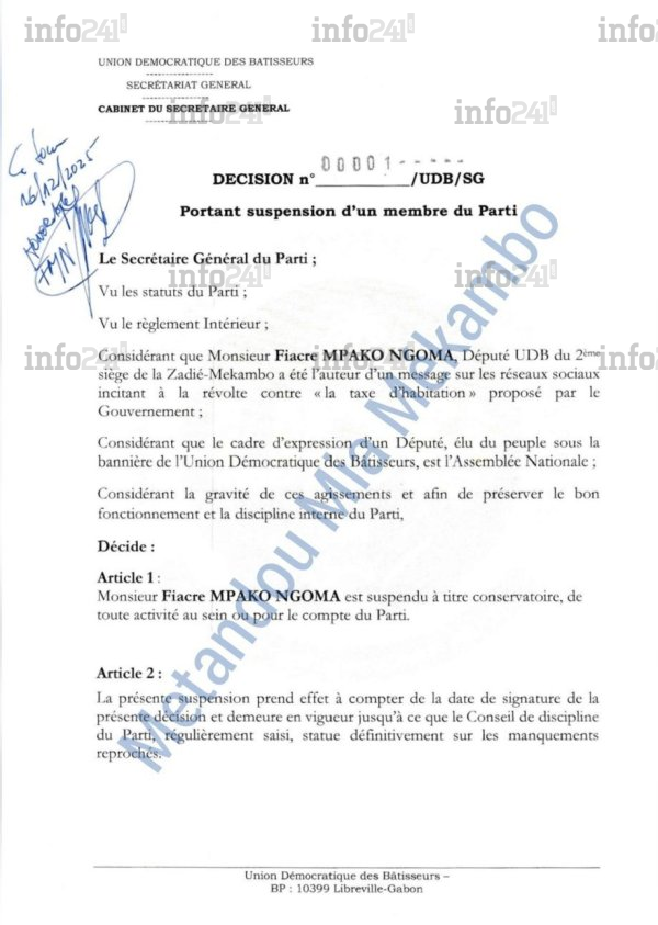 Cette fermeté est directement liée au ton employé par l’élu de la Zadié dans une publication devenue virale. Dans ce message, Fiacre Mpako Ngoma dénonçait la taxe d’habitation comme une « loi injuste, pensée par les ennemis du peuple » et l’attribuait à « ceux qui, tapis dans l’ombre, n’ont jamais vécu la réalité du peuple gabonais ». Des propos jugés inacceptables pour une formation qui porte la politique fiscale du gouvernement, en pleine controverse nationale autour de la TFH.